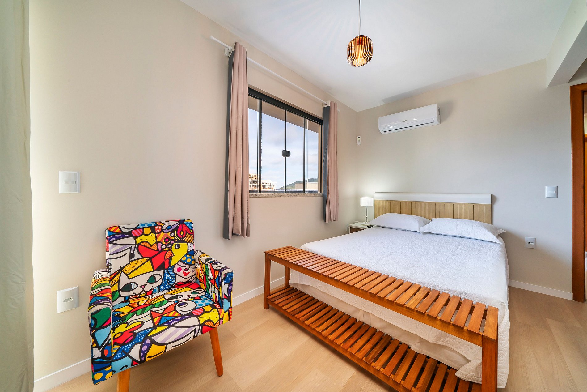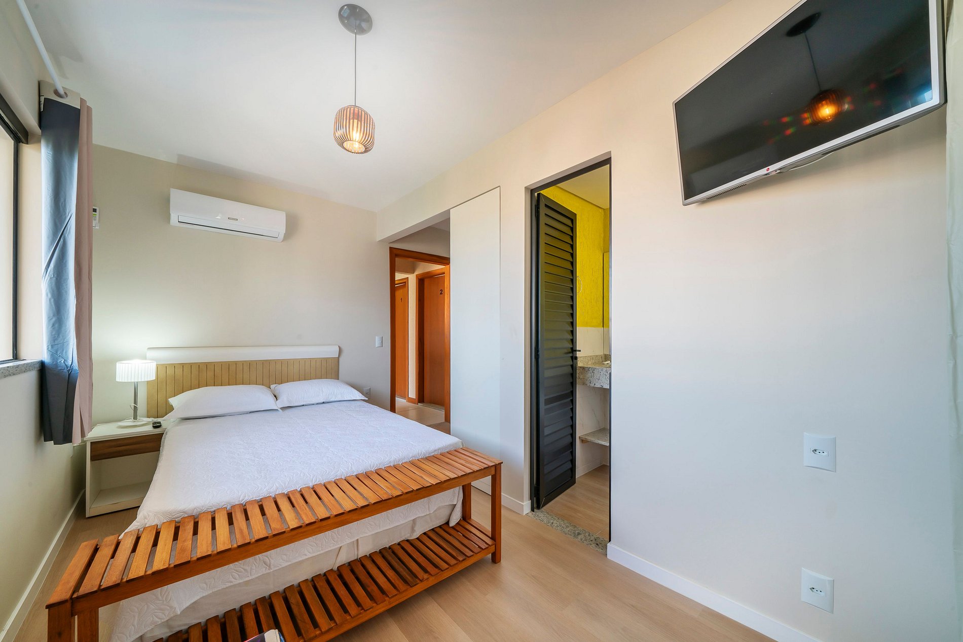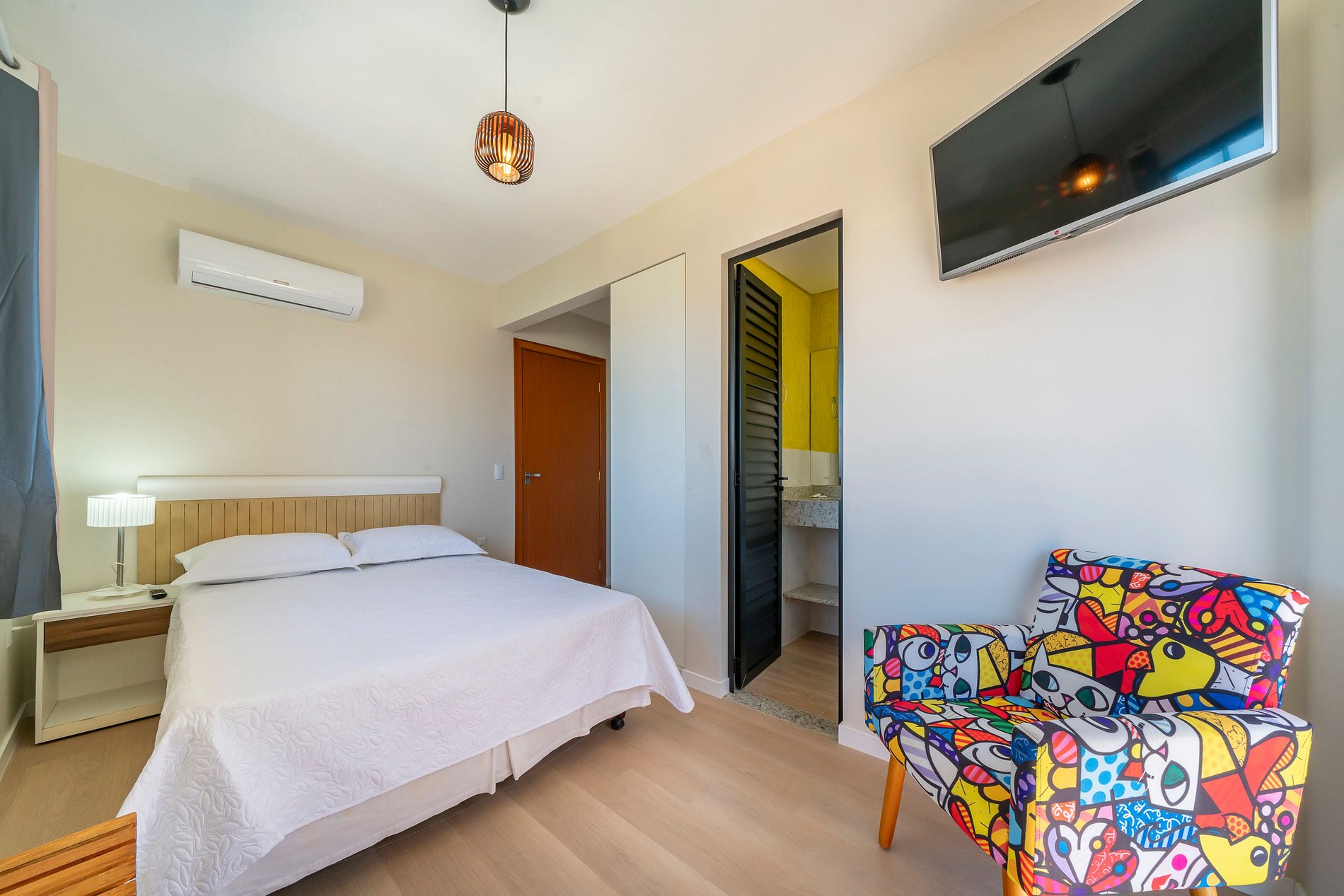 - Banheiro privativo, guarda-roupas e TV no apartamento.