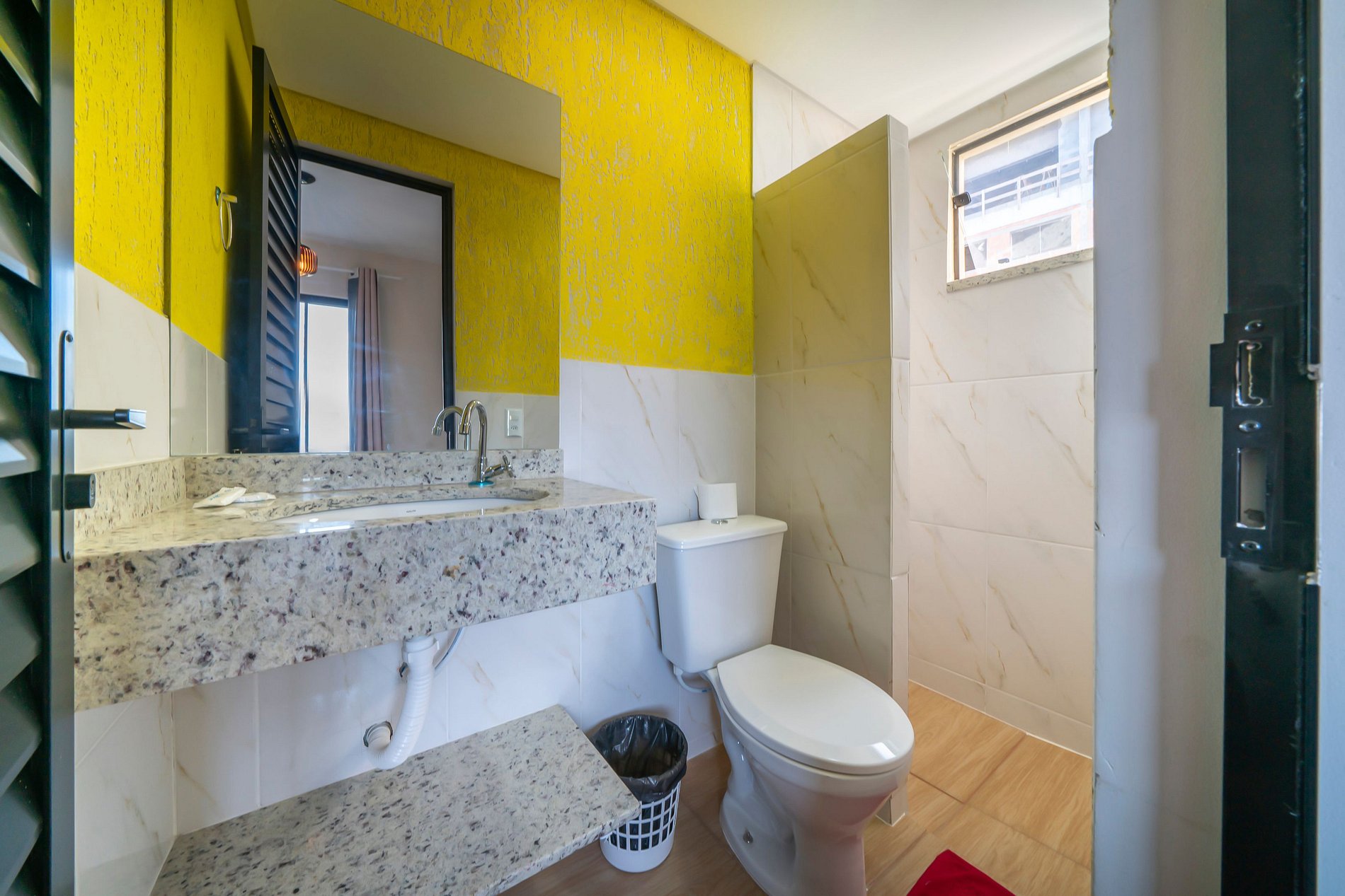 - Banheiro privativo, guarda-roupas e TV no apartamento.