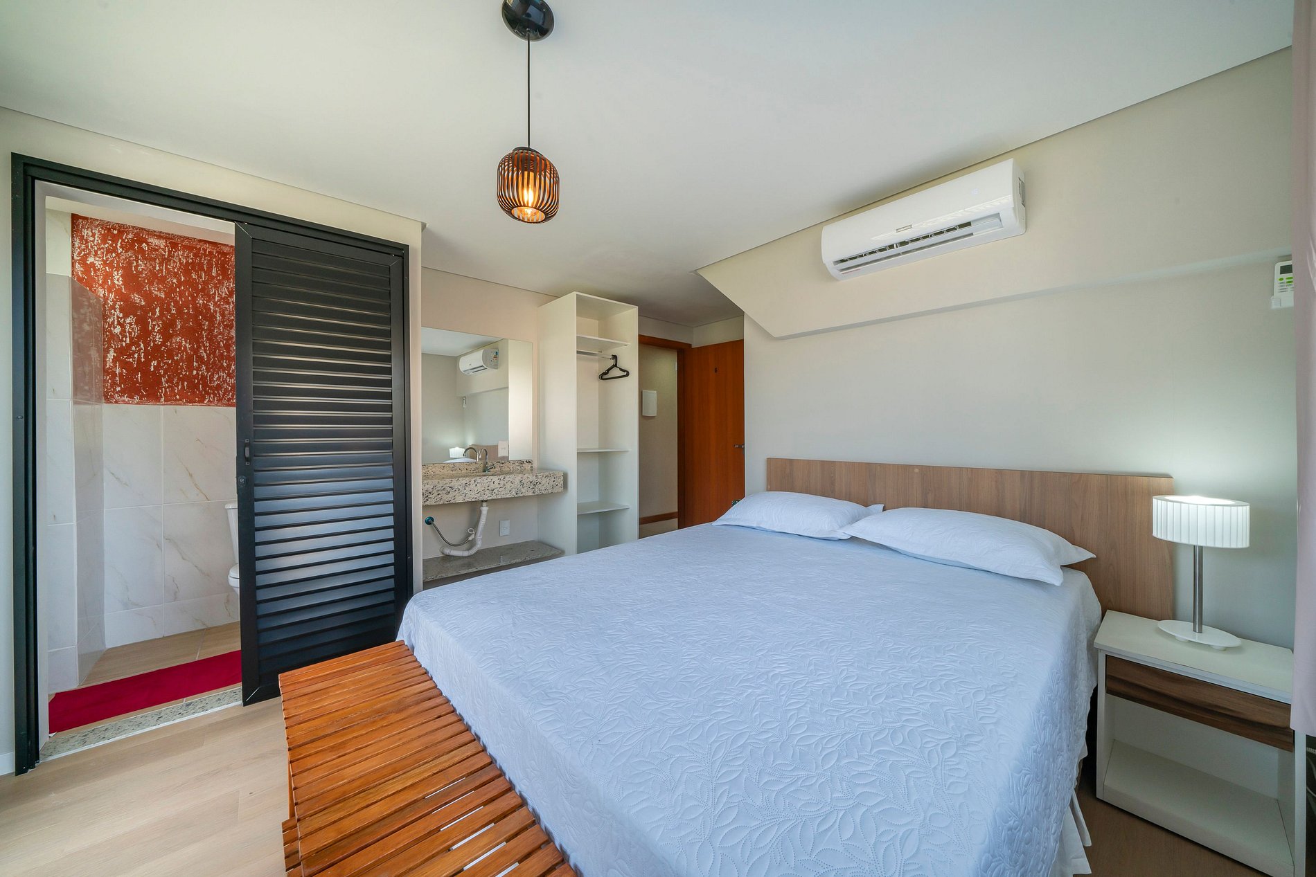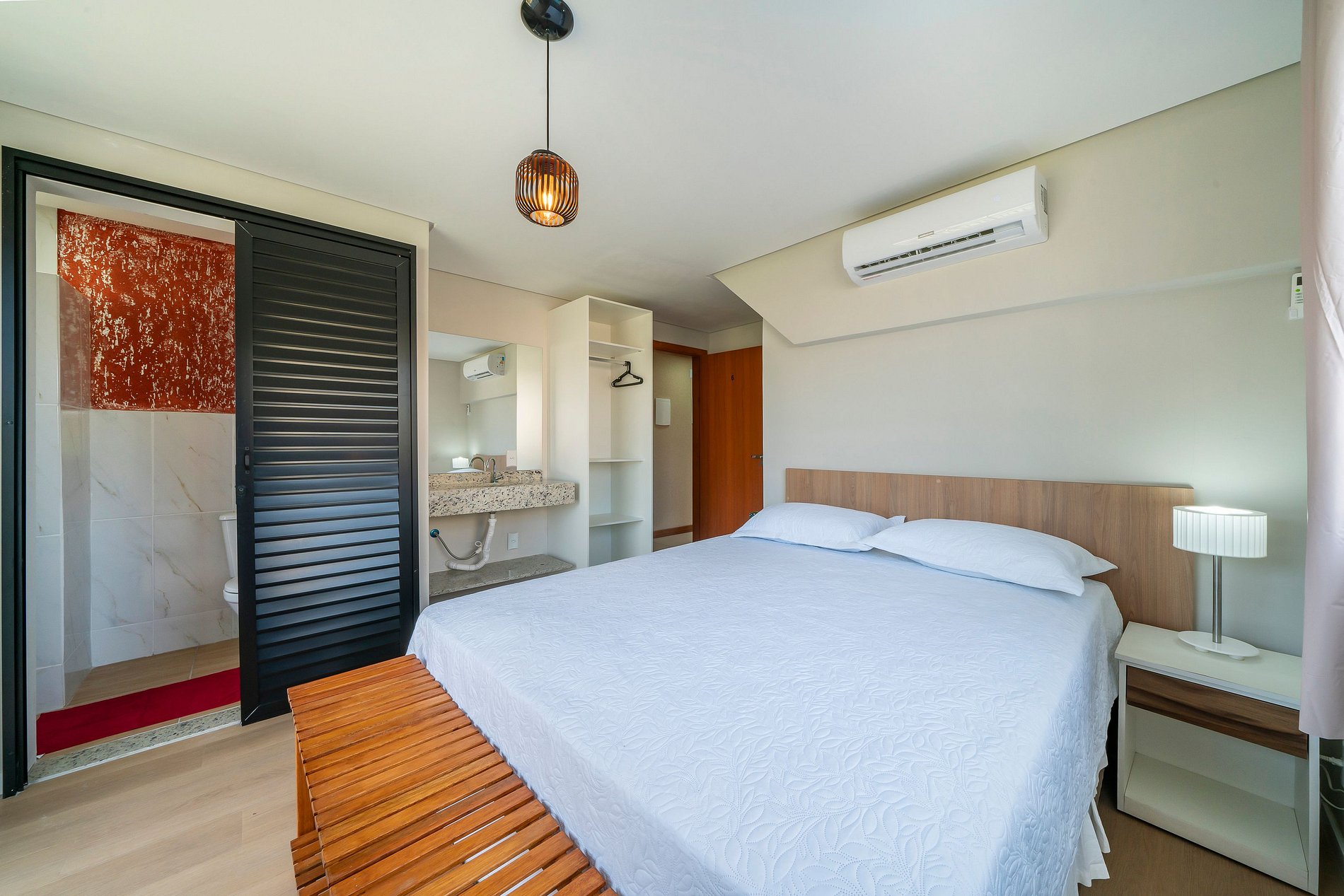 - Banheiro privativo, guarda-roupas e TV no apartamento.