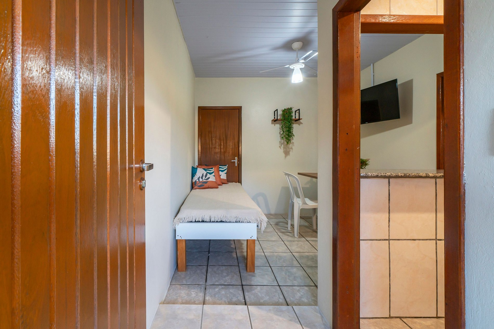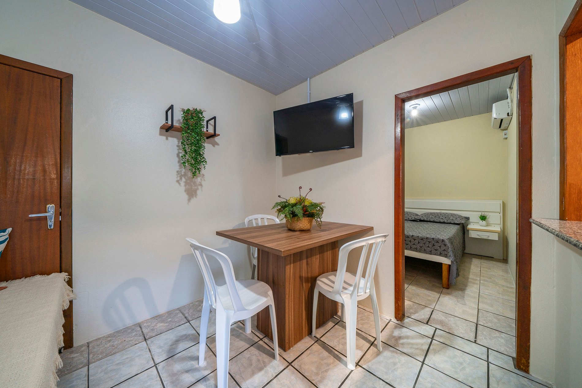 - Banheiro privativo, guarda-roupas e TV no apartamento.