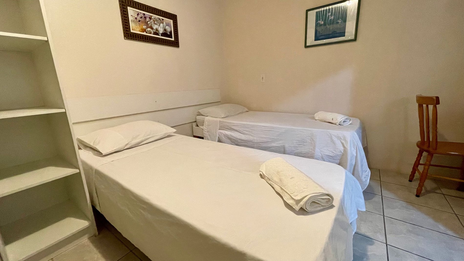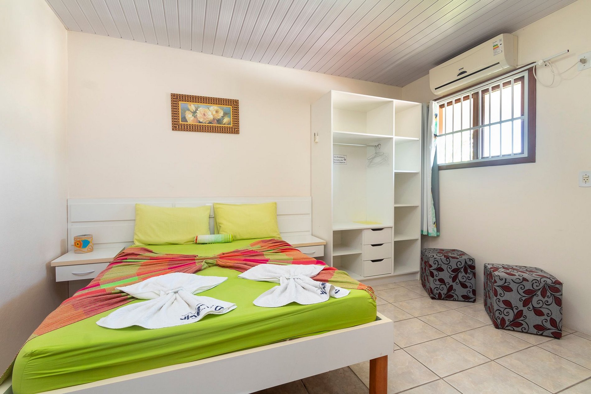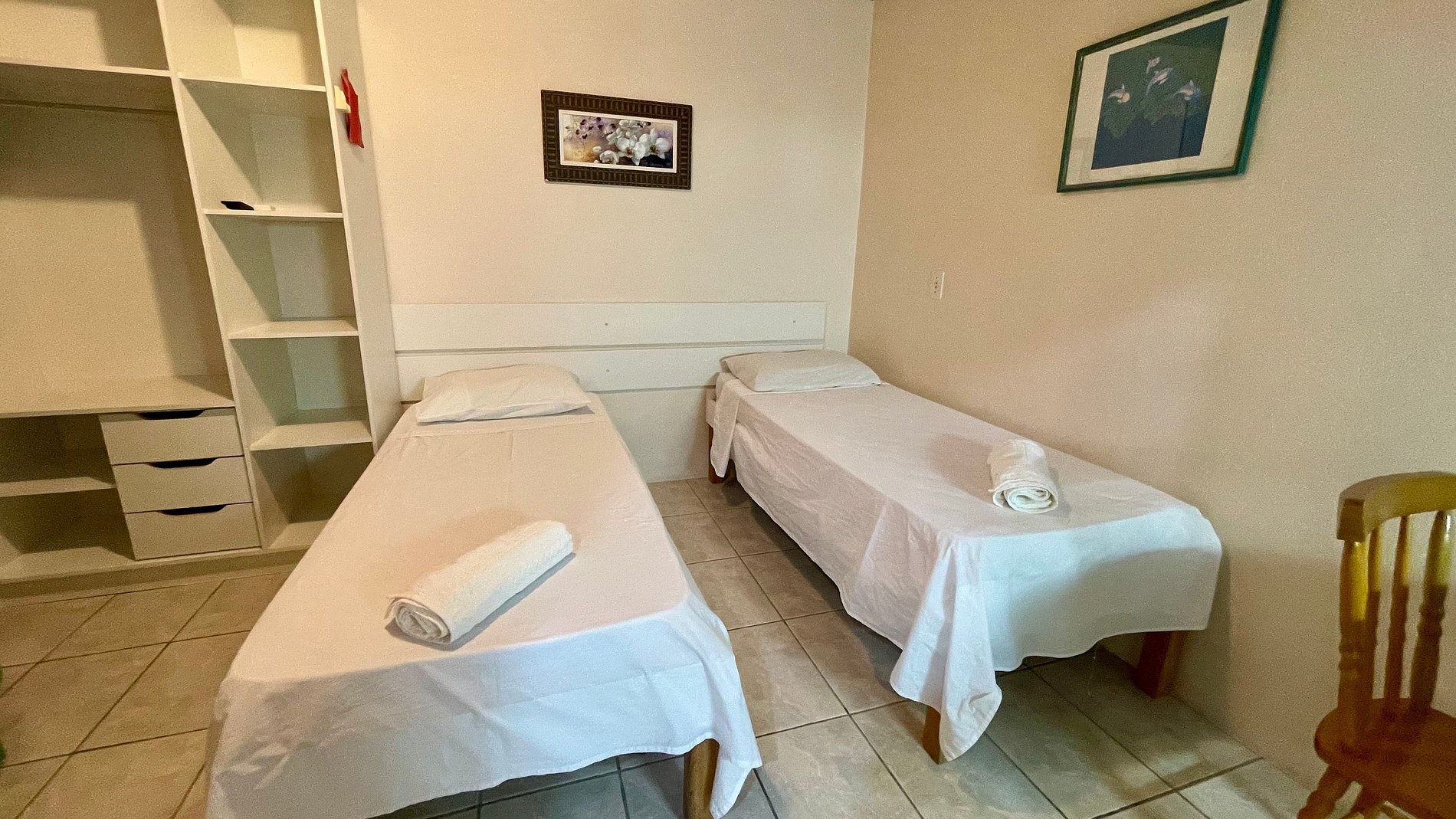 - Banheiro privativo, guarda-roupas e TV no apartamento.