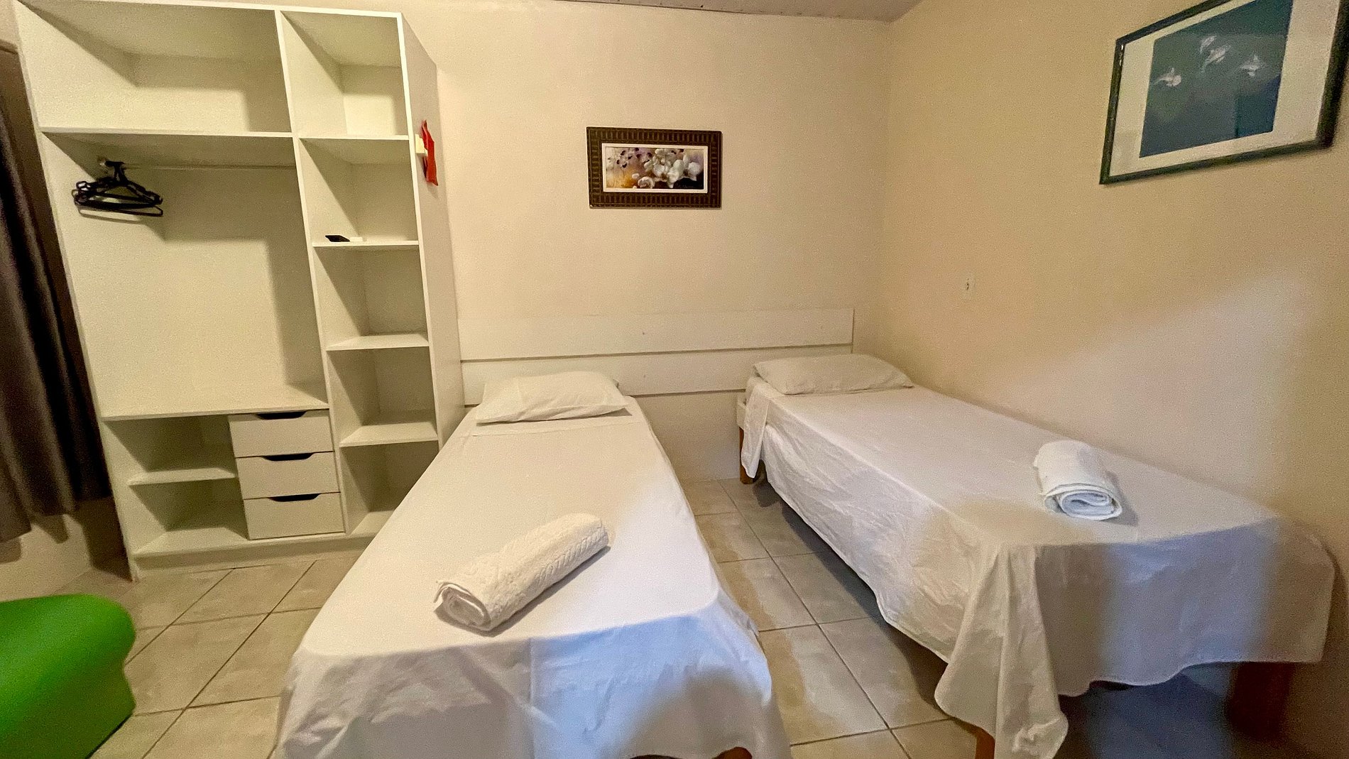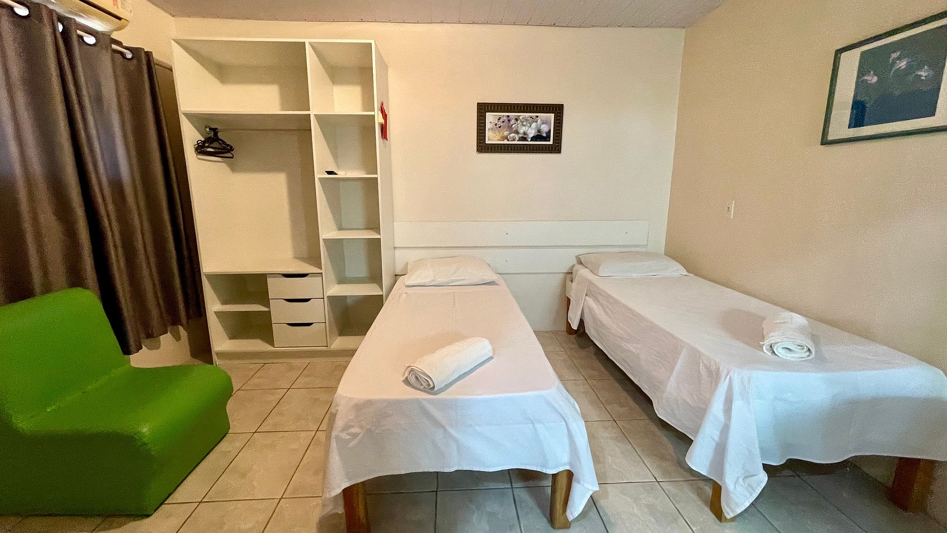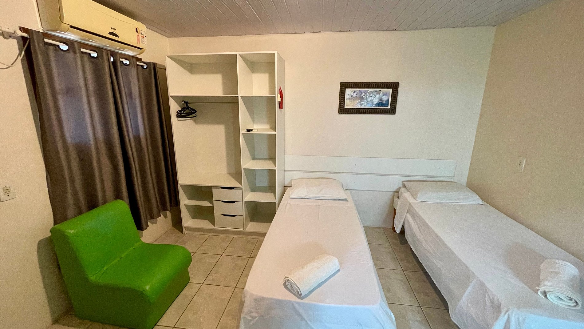 - Banheiro privativo, guarda-roupas e TV no apartamento.