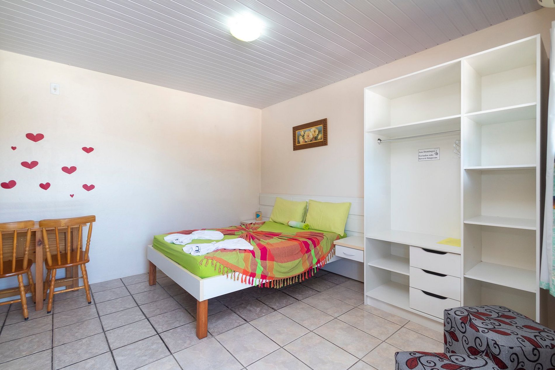 - Banheiro privativo, guarda-roupas e TV no apartamento.