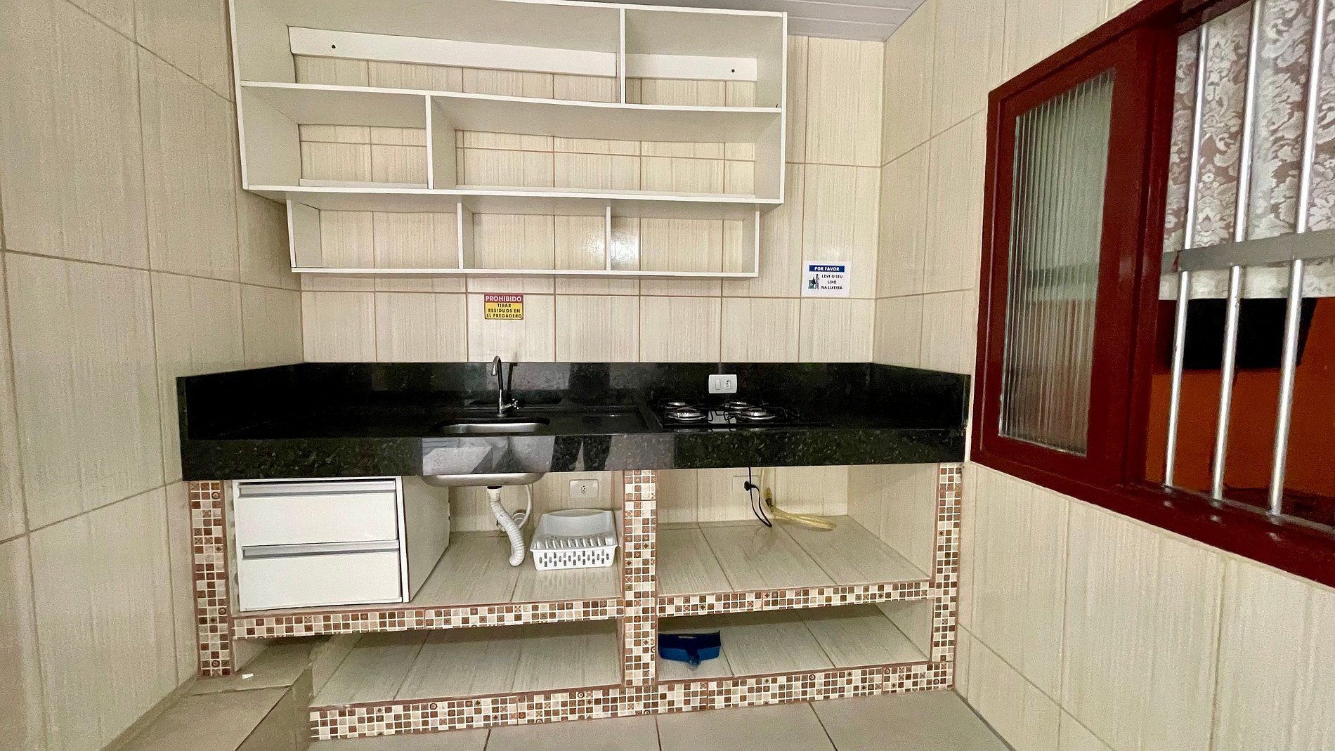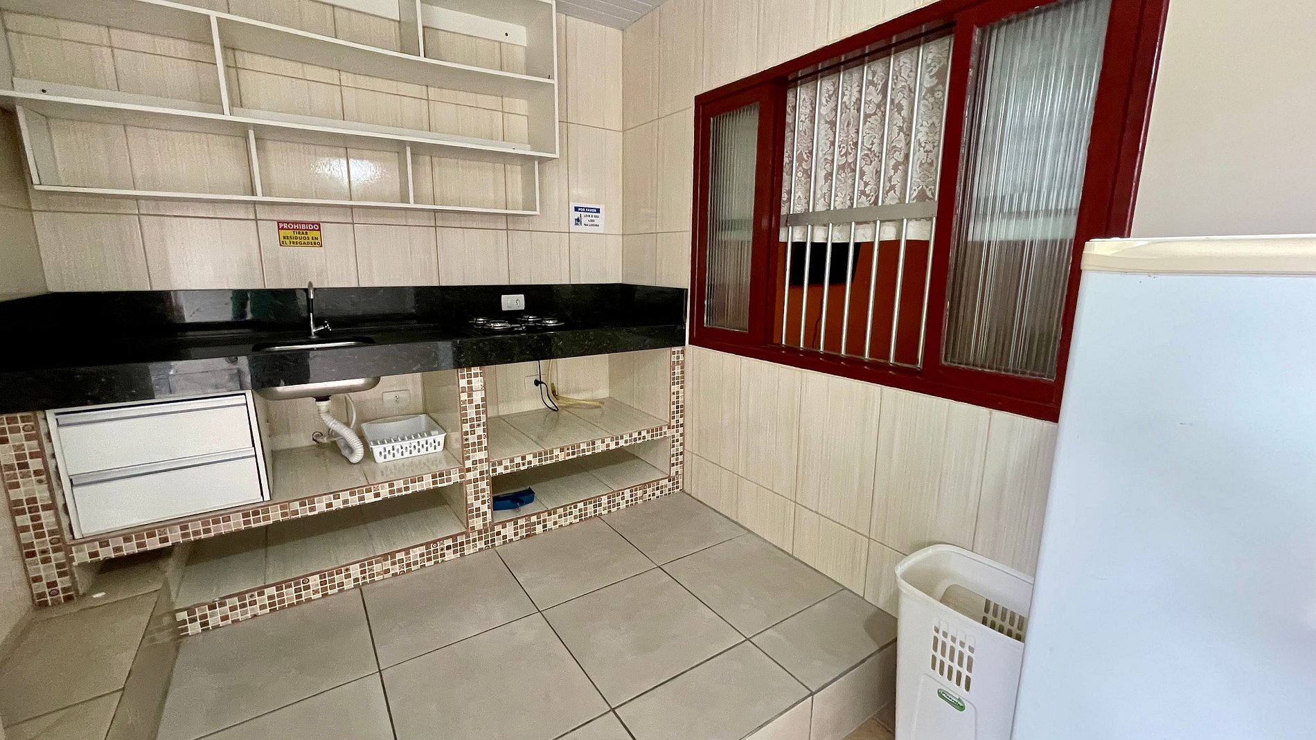 - Cozinha equipada com geladeira, fogão com forno e utensílios completos.