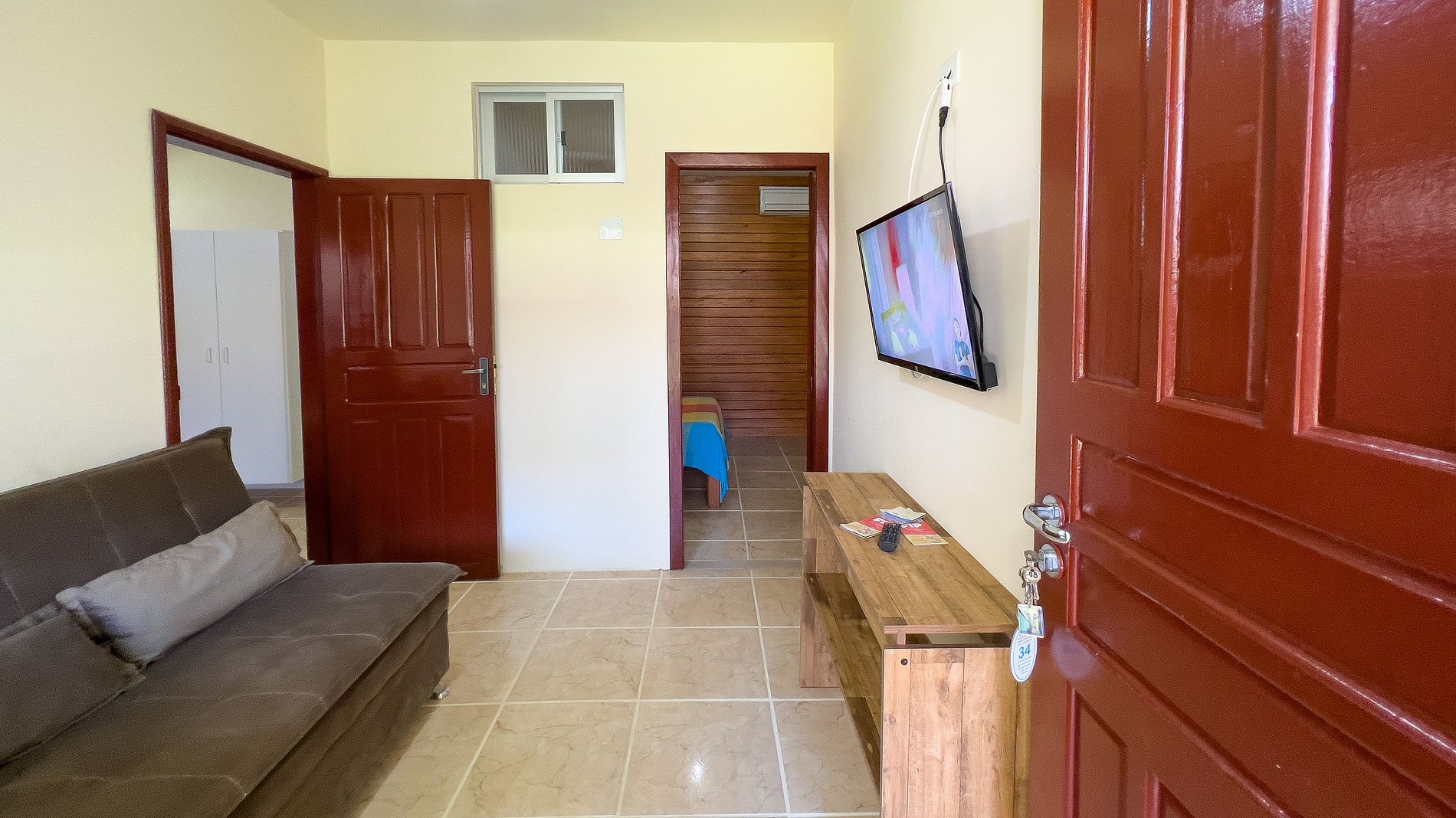 - Banheiro privativo, guarda-roupa e TV no apartamento.