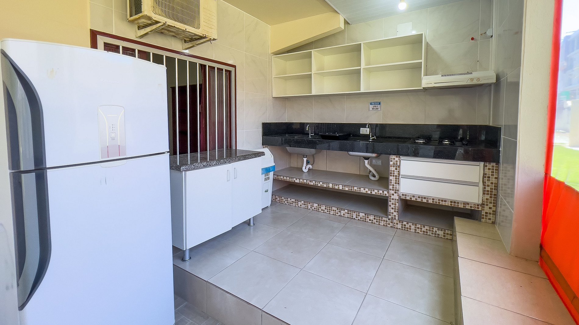 - Cozinha equipada com geladeira, fogão com forno e utensílios completos.