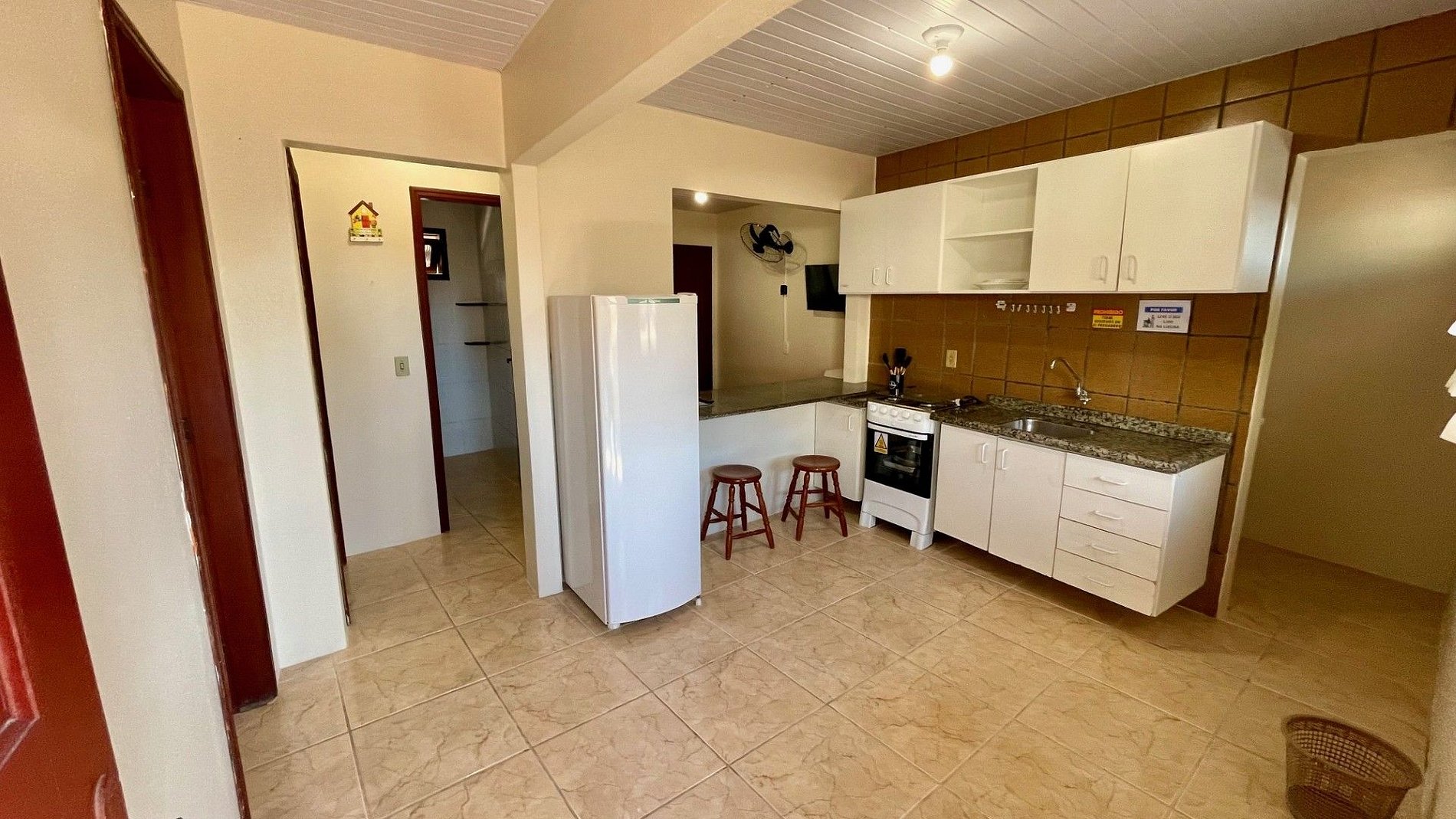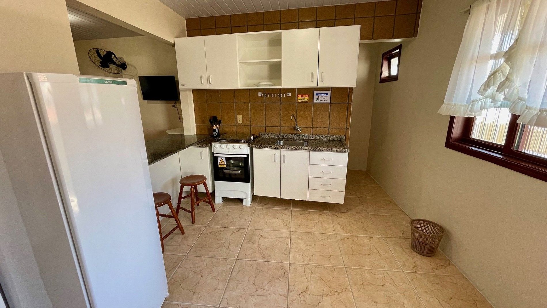 - Cozinha equipada com geladeira, fogão com forno e utensílios completos.