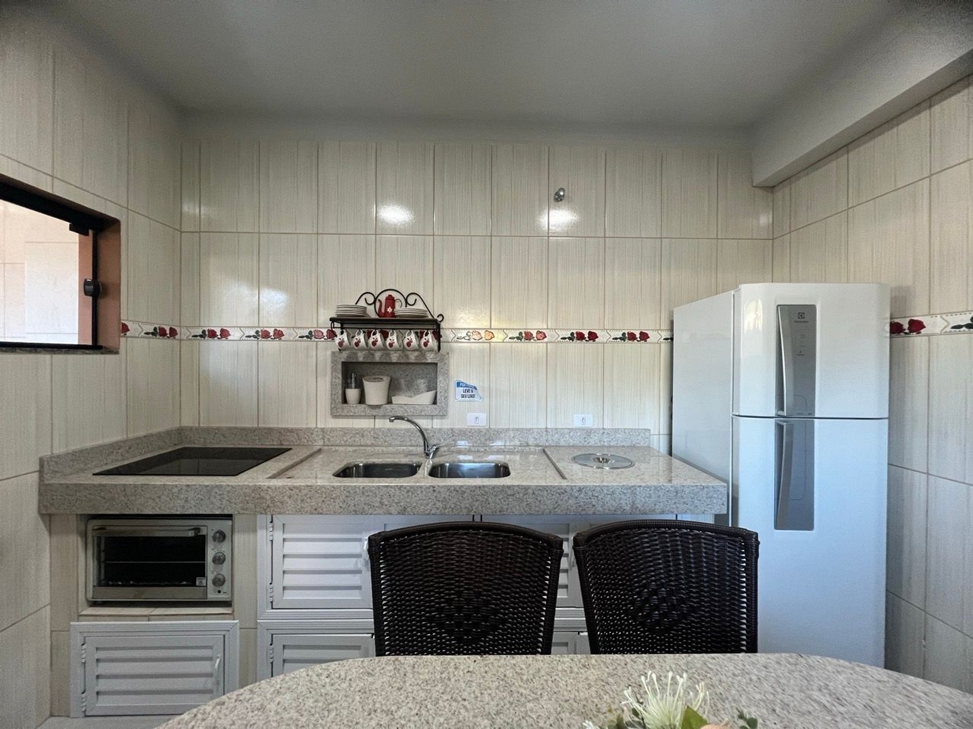 - Cozinha equipada com geladeira, fogão com forno e utensílios completos.